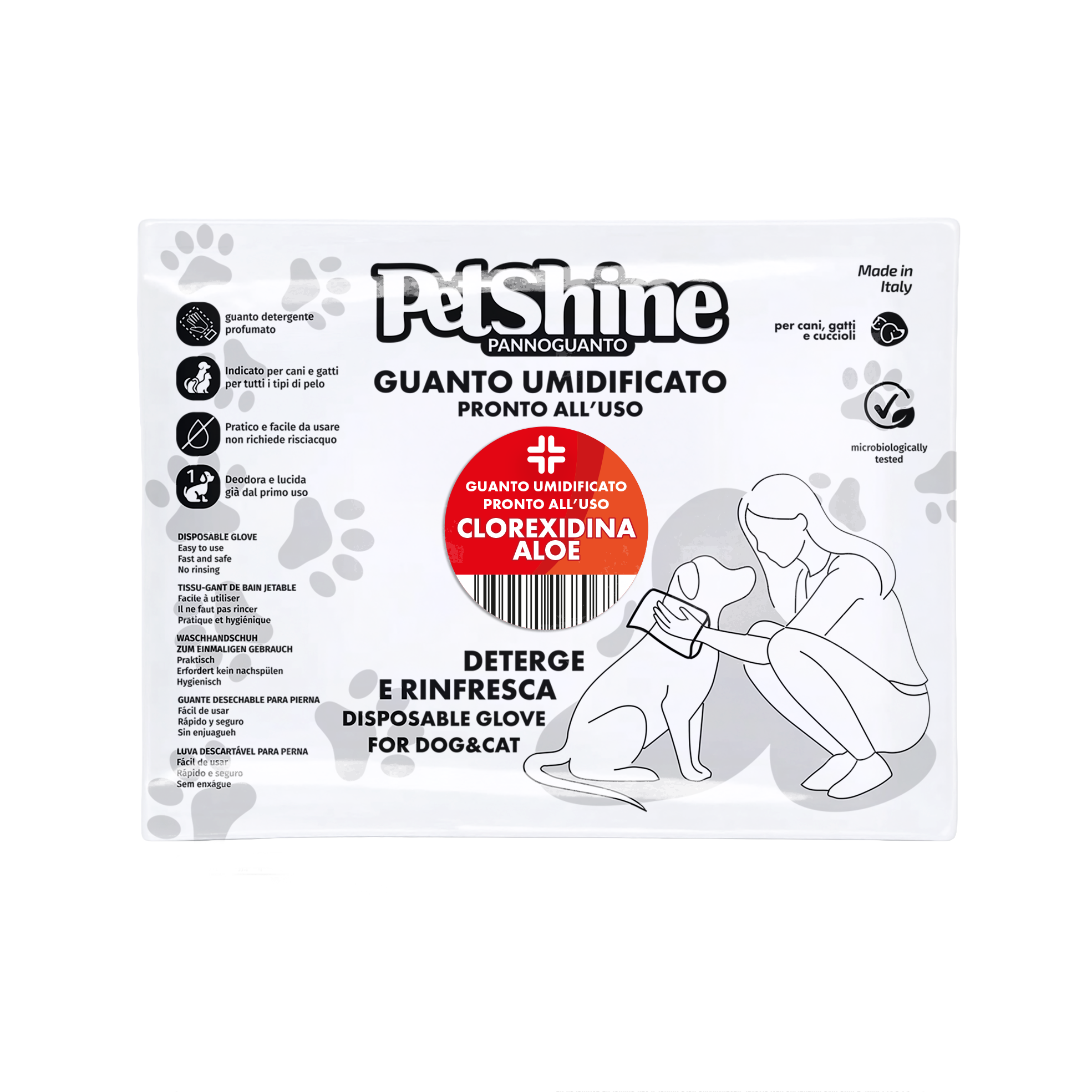 Pannoguanto Clorexidina è il guanto umidificato professionale formulato per la pulizia e l'igiene del vostro animale domestico. Imbevuto di detergente delicato non schiumoso con Clorexidina, non richiede risciacquo.